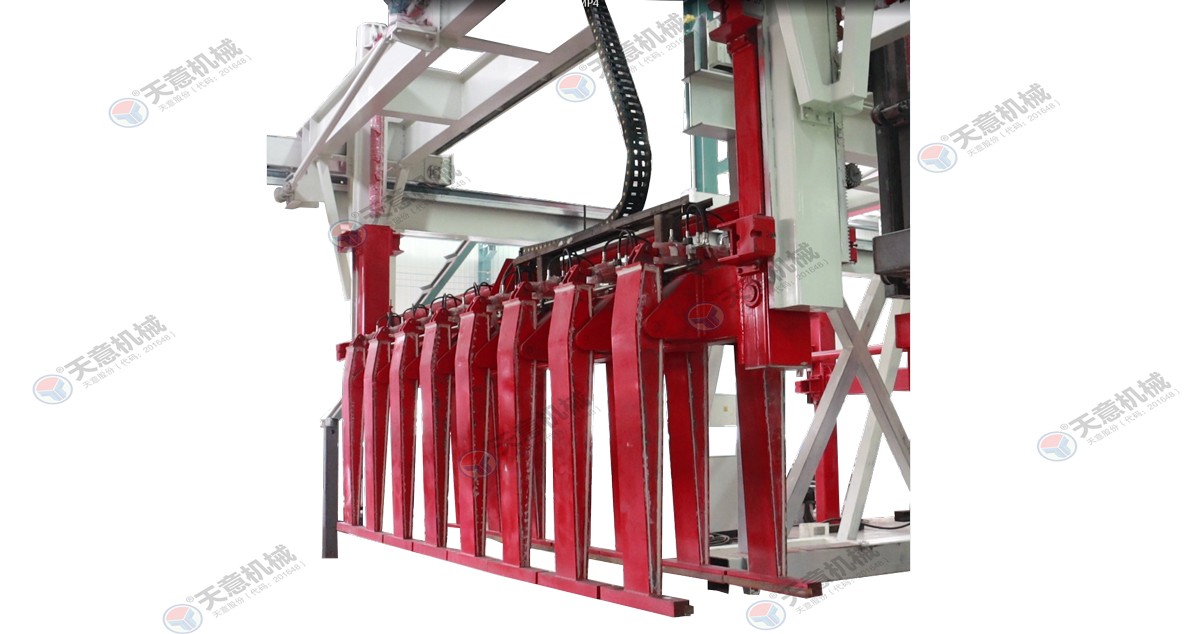 成品分垛吊機:將蒸養車上的一模坯體吊運至掰板輸送機上,然后將空側板吊運至蒸養車上;切割工段空翻脫模機將模框翻轉90°,放在切割小車支座上進行脫模,脫模后的模框與清理后的側模板進行合模,合膜后的空模框被吊...