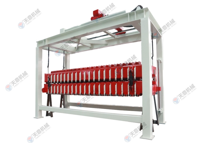 脫模后的坯體連同側板一起放置在切割小車上,切割小車由減速電機驅動行走,通過縱向切割機完成縱向切割,切割小車繼續行走至橫向 切割機中間位置停止后,由小車置換裝置將側板連同坯體抬起,切割小車退回翻轉行車底下進行下一次承載脫模后的坯體,另外一部切割小車 進入置換裝置底下后, 置換裝置將側板連同坯體放置該切割小車上后,橫向切割動作后啟動進行橫向切割動作,切割完成后,切割小車再行走至確地行車底下,再由 翻轉去底行車將坯體去底(連側板)吊至蒸養小車上,切割小車范圍原始位置進行下一個切割循環。